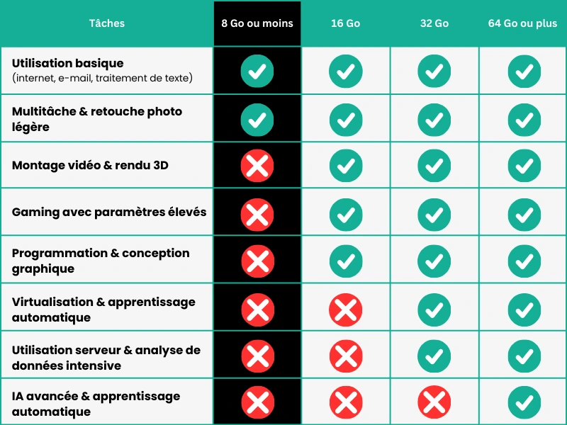 Vous souhaitez vous lancer dans le montage vidéo ou utiliser des logiciels 3D ? Dans ce cas, il est recommandé d’avoir plus de mémoire, comme 16 Go, 32 Go ou 64 Go.